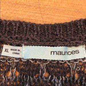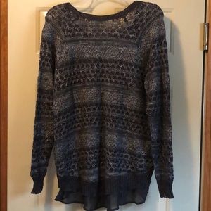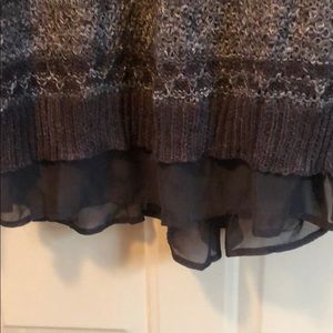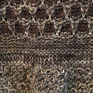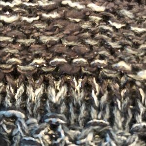 Long sleeve loose knit charcoal gray and light gray with silver threading running through the sweater. Has layering look at waist... worn once