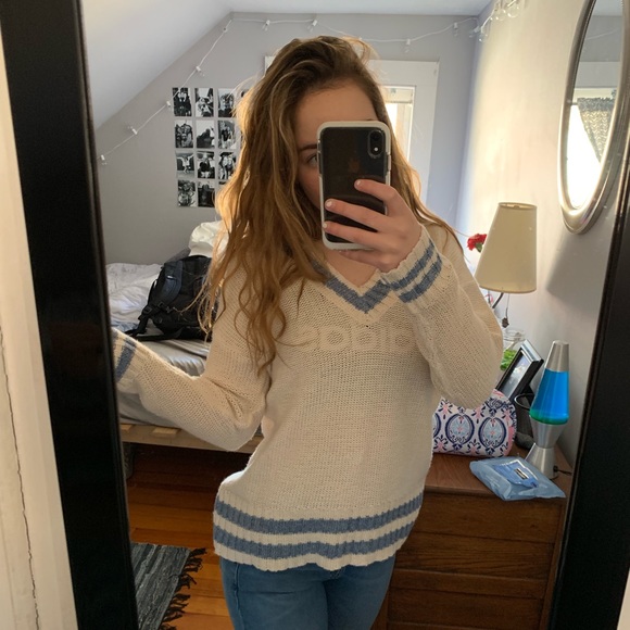 White and blue V Neck sweater. warm, cozy, never worn (except for photo). great quality.