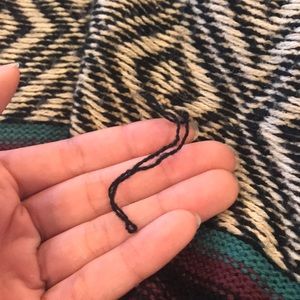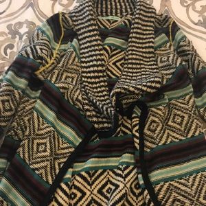 Teal, blue, maroon, black, tan, cardigan. Yellow stitching on shoulder. Cozy. Two spot where knitting is loose, hard to notice with all the patterns going on.