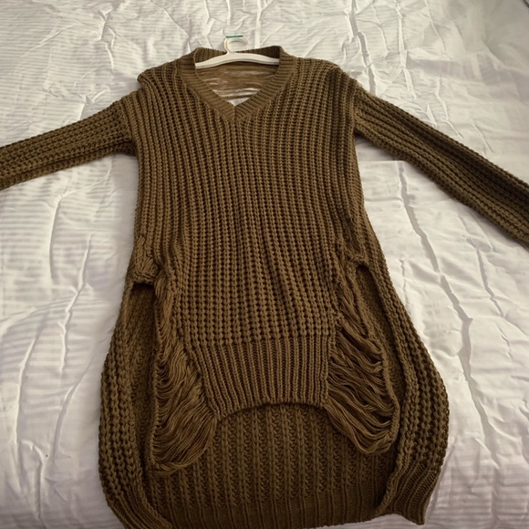 High low sweater dress. Can be worn as sweater or dress. Very thick. Worn once. Dark grew. Color. Shredded detail material on front and back. Smoke free home. From fashion nova