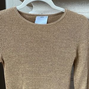 Gold sparkle, ribbed crew neck fitted sweater from Dash. Worn once. 59% viscose rayon, 27% nylon, 14%!polyester. Machine wash and hang dry. Perfectt for any occasion soon to dress up or down- and amazing for the holidays!