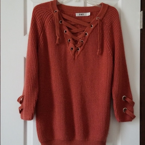 Women's sweater. Metal grommets and ties at neck and sleeves.