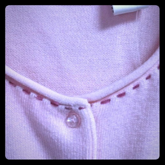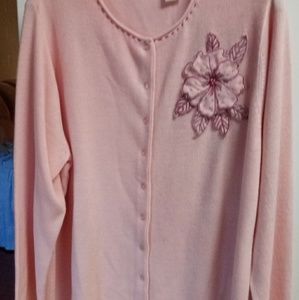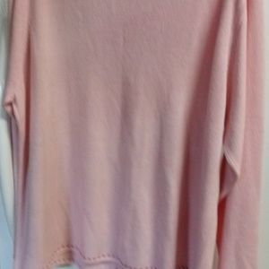 Pink sweater trimmed in burgundy with flower. Length from shoulder is 26 1/2' and waist 24'.