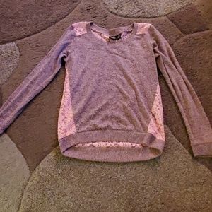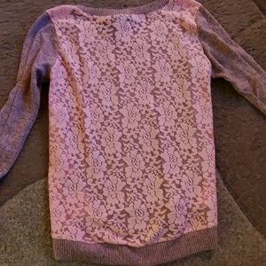 Rose pink with pink floral lace back. Long sleeve, light wear. Polyester and rayon blend.