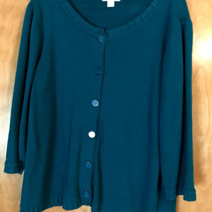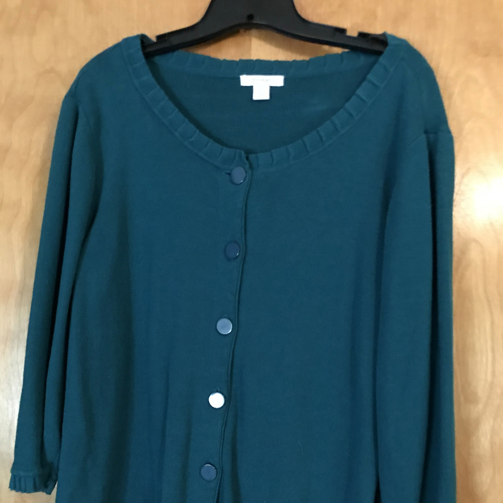 Very pretty green (picture looks blue, but it's more of a shade of green) button-up, long sleeved sweater. Just worn one time.