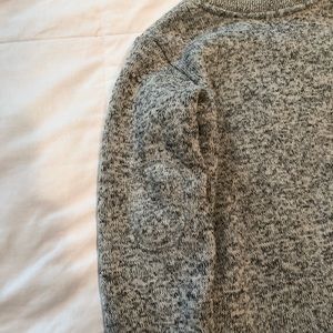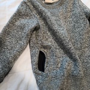 Gray marked sweater with side hidden pockets and elbow patch in matching material. It is a little thick but soft