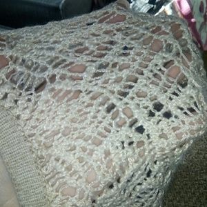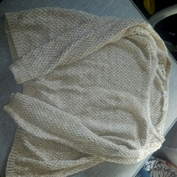 Tan and cream color. Knit sweater. See through shoulders. Large sleeves.