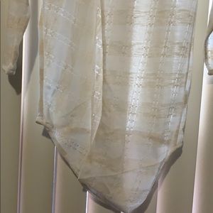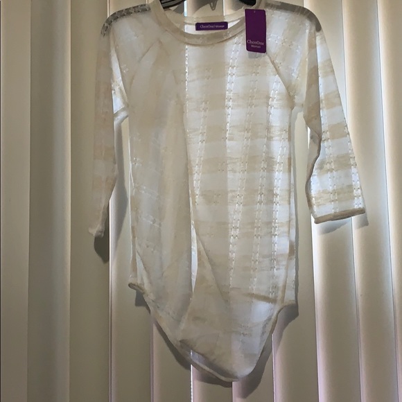 see thru sweater w cream and white colored stripes. weird pouch like design on the bottom?? was a gift never worn