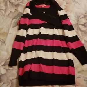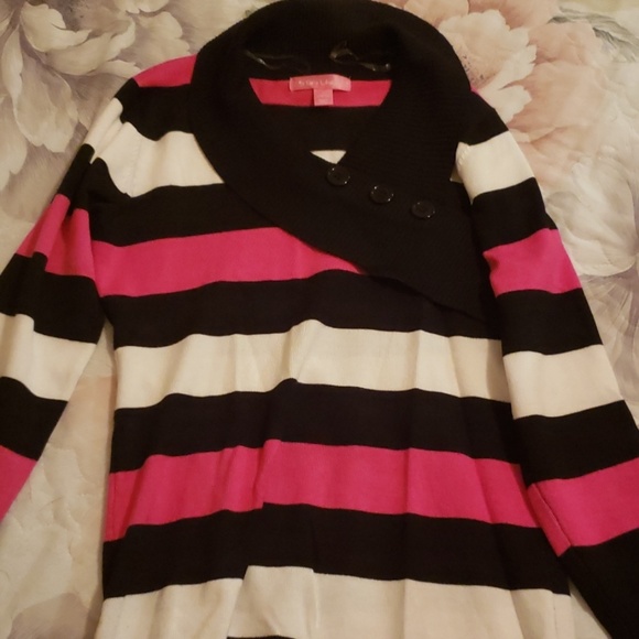 Pink, black and white sweater with buttons on the colar and sleeves.