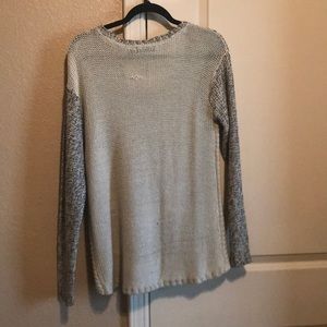 Grey and white. Asymmetrical design. Long sleeve. Knitted.