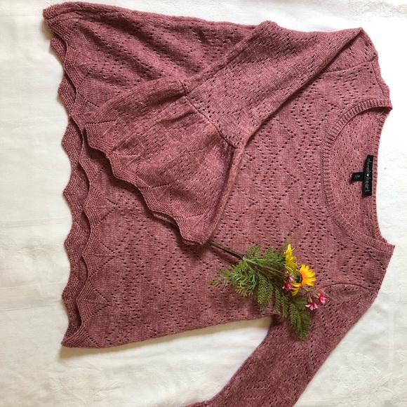 Pale brick red/pinkish sweater with reverse scalloped hemline and bell sleeves, worn twice