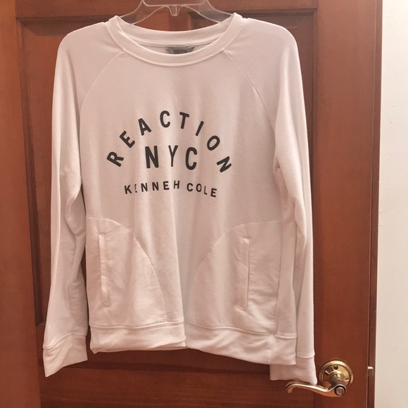 This is a Kenneth Cole white sweater with black writing and pockets. Only worn once really good condition. The size is small but it runs big