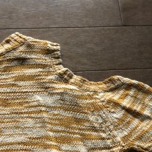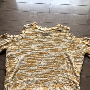 Orange and cream, thin, cold-shoulder sweater. Slightly longer in the bag. Comfy and light