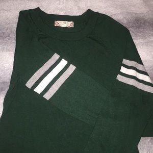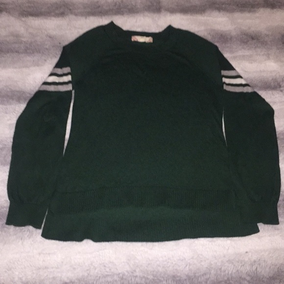 Dark green sweater with white and grey stripes on the sleeves. The back side is a little longer than front and a very light wearing sweater
