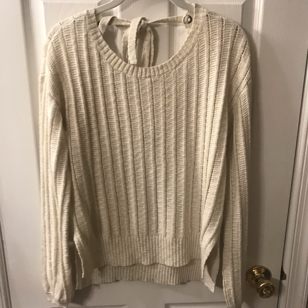 This sweater is from American Eagle and is a small worn 2-3 times. This sweater has a low cut back with a bow and is off-white colored.