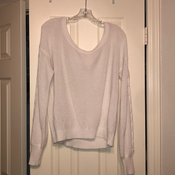 White, sweater with lace detail on sleeves, can be worn as a one shoulder top, worn once