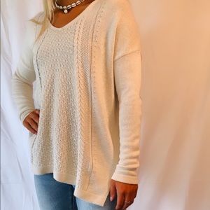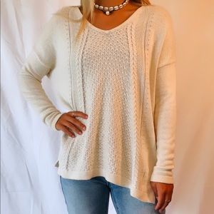 Cute flowy sweater. Can be paired with leggings or jeans! Keeps you warm and has a knitted design on the front!