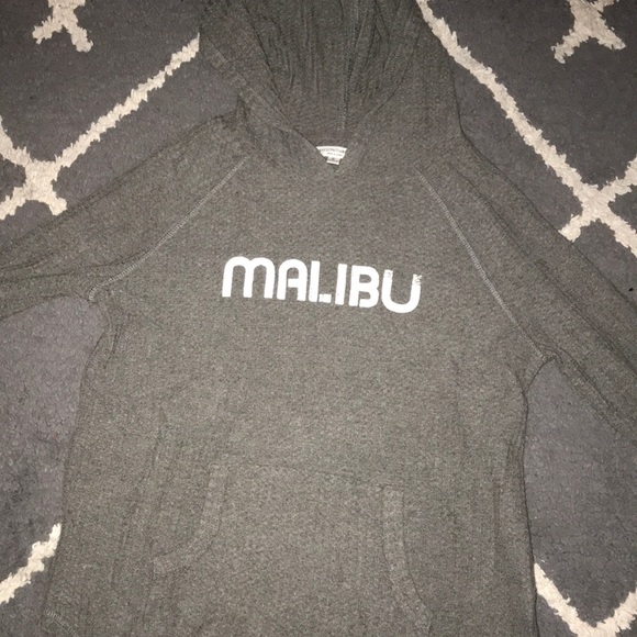 Long sleeve grey sweater with a hoodie, that says “Malibu” on the front