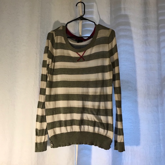 Super cute striped sweater with purple accents! Elbow pads make the sweater a must buy. Really soft and in great condition! Tag says xl but fits Large or X-Large!