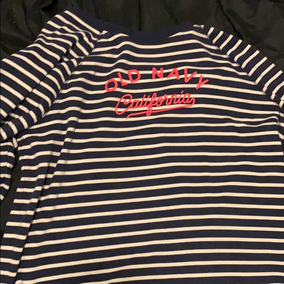 It’s navy blue and white strips. It’s super soft on the inside and perfect for when it’s getting colder outside.