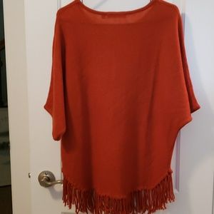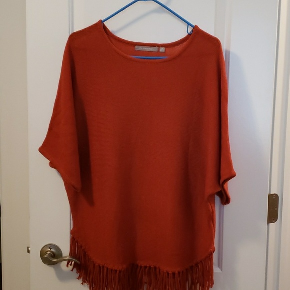 Great fall sweater. Thin and light. Can be worn with black long sleeve undershirt. 100% acrylic.