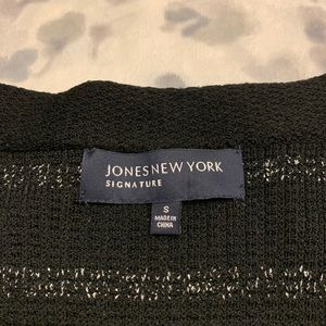 Jones New York Cardigan in black with metallic silver stripes. Dressy, has clasp only not button down.