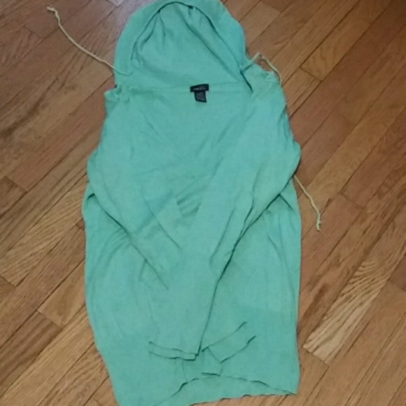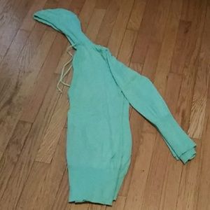 Seafoam green or light aqua hoodie. Adjustable tie for hoodie, V-Neck style with pockets in front. Double sleeved as shown in 3rd pic.
