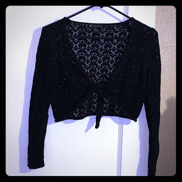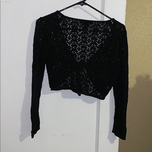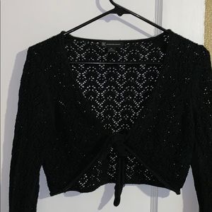 Black knit v-neck half sweater ties in the front. Perfect for wearing over a sleeveless dress or top. 70% silk, 30% cotton. Offers welcome.