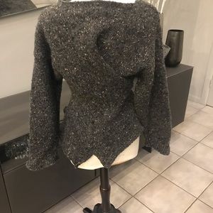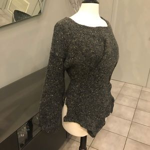 Asymmetrical up cycled sweater from a posh boutique in Brooklyn. I’ve never seen another like it. It’s super cool and edgy! It hasn’t fit me for years and I’m sad to see it go but I’m making room...the fabric is a wool blend.