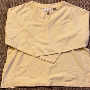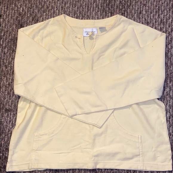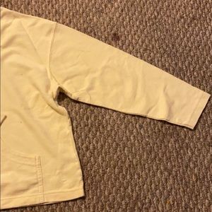Thin Sweatshirt or pull over. Color is yellow! First picture is with flash on then the next is flash off. Has a front pocket and I believe the sleeves are quarter sleeve. I’ve only worn it once!