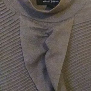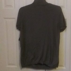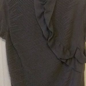 Gray short sleeved mock neck sweater with ruffles and lined details on the front.
