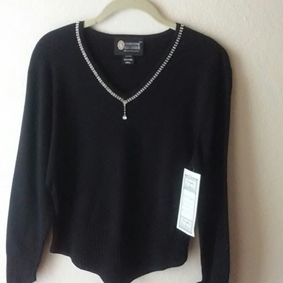 Black with rhinestones around the v-neck collar. New with tags attached.