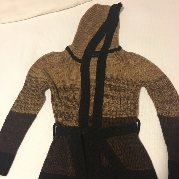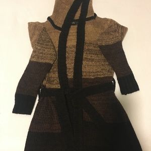 Multi colored brown hooded sweater. soft and comfy with ties around the waist to be tied in front or behind.