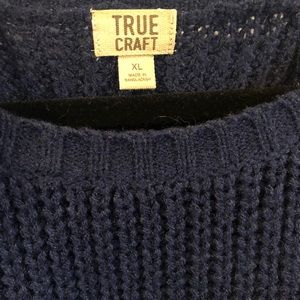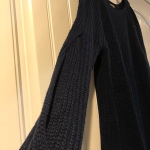 Navy blue open shoulder sweater. Sleeve design also opens at forearm and closes at wrist. Long enough to wear with leggings. Like new
