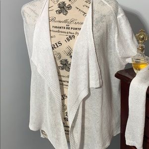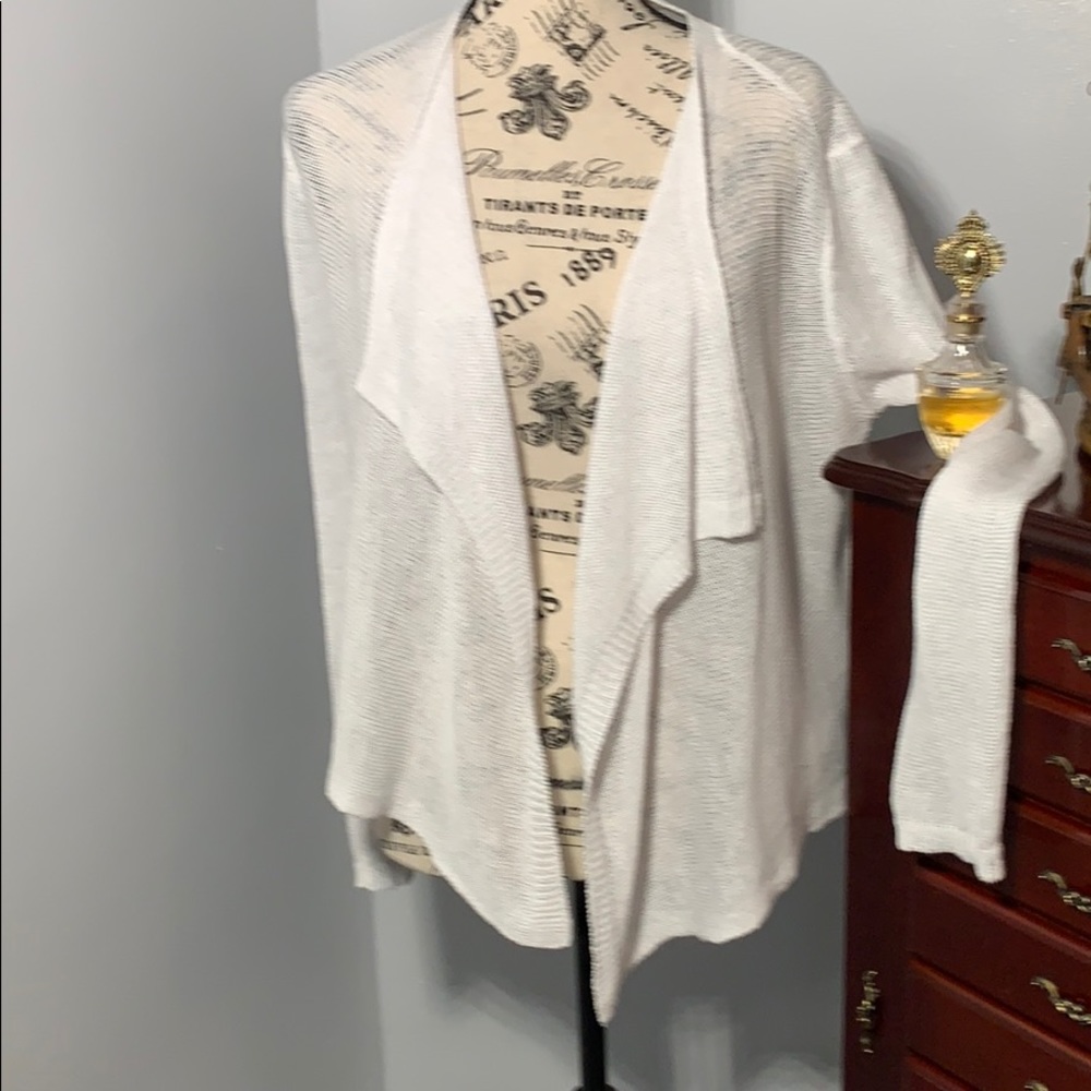 Sweater is a perfect accent for any tee or tank underneath. I wore it with a green cotton skirt and white tee. The 100 percent organic linen is soft and comfortable. Perfect condition. Article dimensions: length front tail 26”, sleeve 24”.