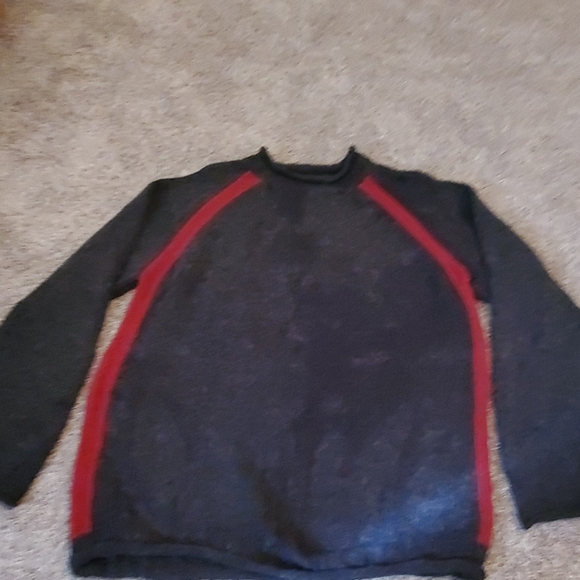 Gray sweater with red accents. The picture makes the sweater look splotchy - its fuzzy giving the photos a variation in color. This sweater has never been worn, tags have been removed.