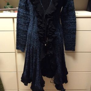 Long black and blue sweater, has ruffles all around the back and front, it’s about 41 inches long, worn one time, this is also a smoke free home,is in very good condition