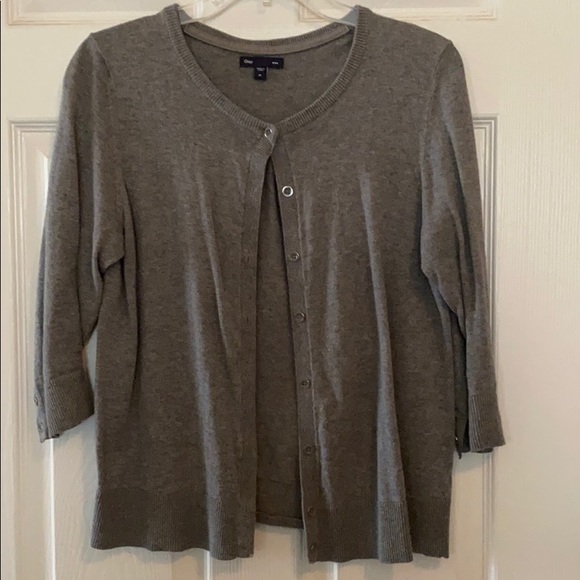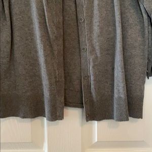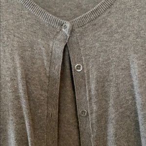 Grey sweater, ribbed on collar, down button line, bottom and end of quartered sleeves which have 2 decorative buttons on each sleeve.