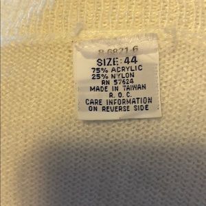 Very nice sweater, used but no stains. Cream color. Take with name was cut off.