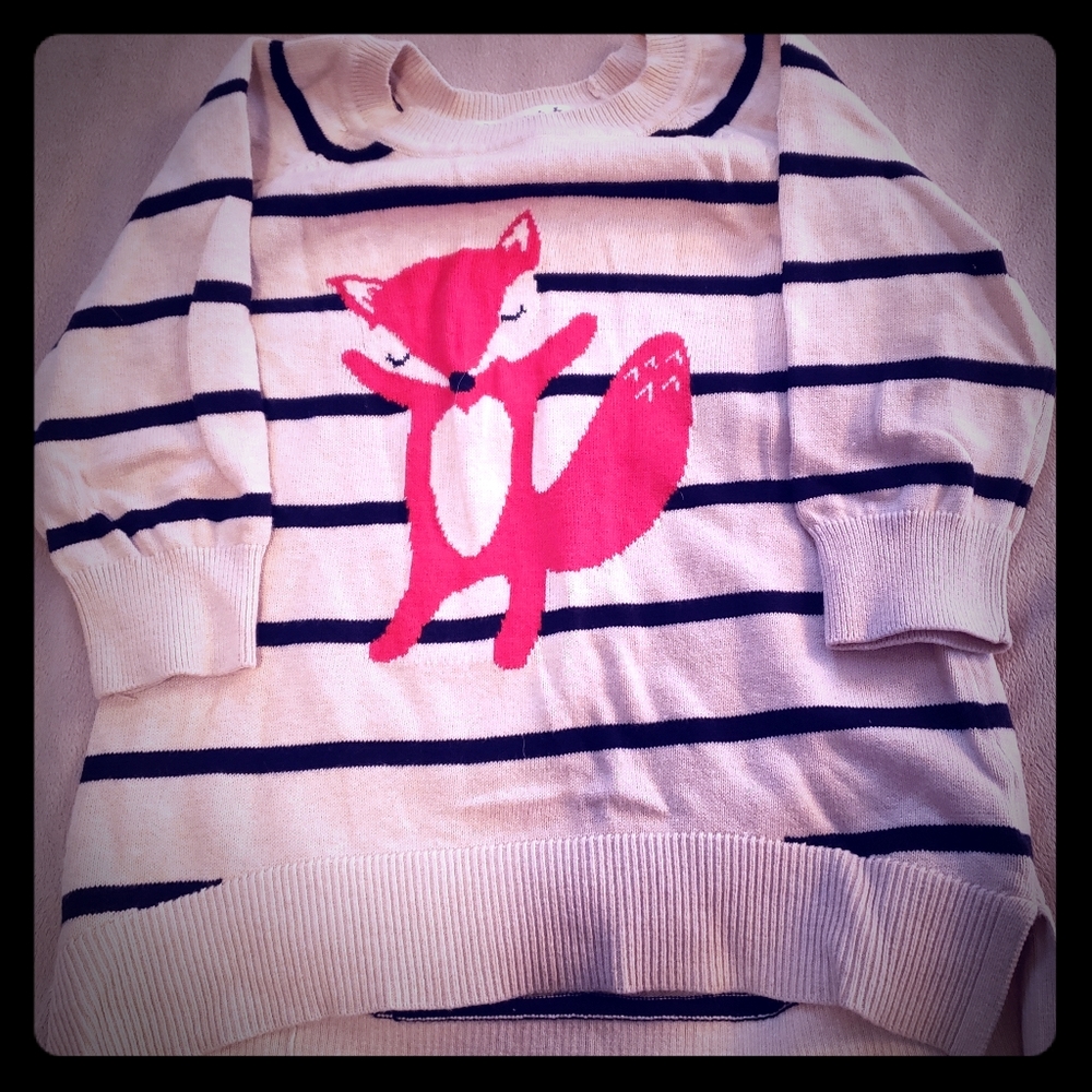 Tan sweater with navy stripes. Red fox on center. 3/4 sleeve.
