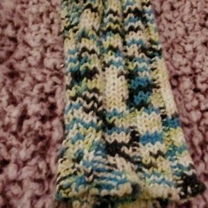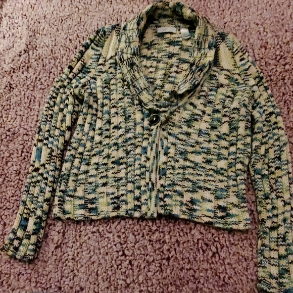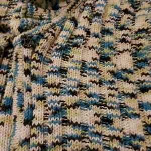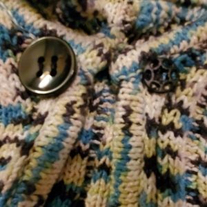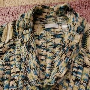 Gorgeous cable knit, open front with one button snap closure. White, blue, green and black tribal pattern. Sure to keep you warm and cozy on these cold winter days. Snuggle up in style.Measures underarm to underarm 21 inches. Shoulder to hem. 22 inches
