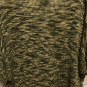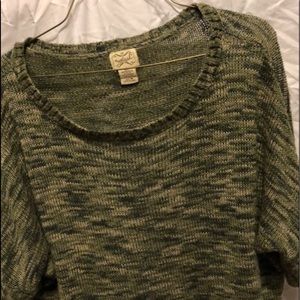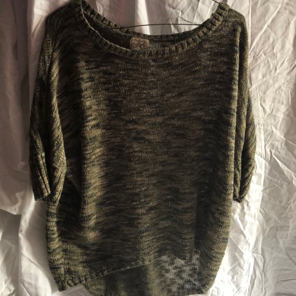 Green, off the shoulder short light weight sweater. It has mid length sleeves.