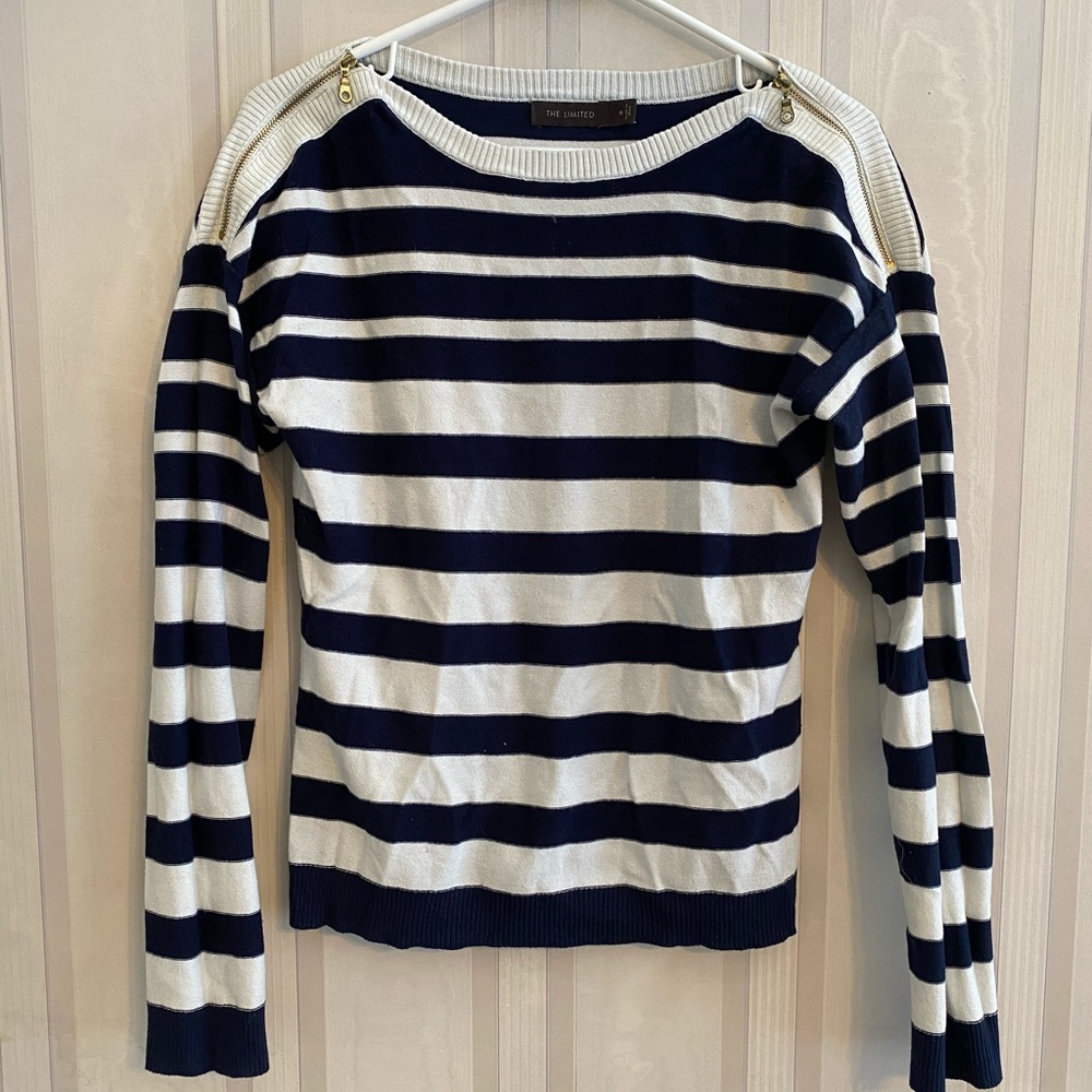 Medium white and navy gently used sweater. Zippers on shoulder. The Limited.