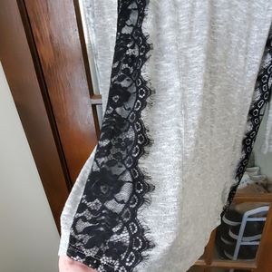 Grey with black lace detail on the sides. Has criss cross on the back. Soft sweater material. Gently used