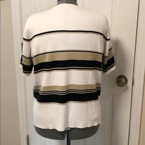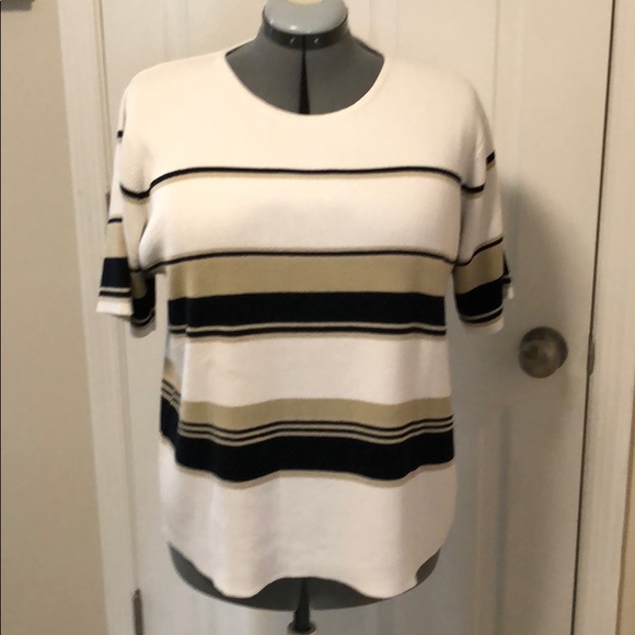 Black, tan and cream sweater. Has no tag, but I am pretty sure it is Liz Baker, size 2x. It measures 24” from arm pit to arm pit.