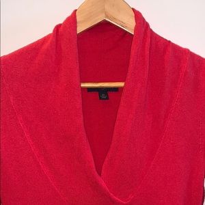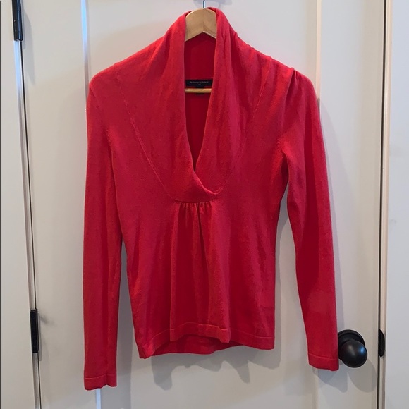 Deep V-neck lightweight sweater. Fits at the waist, mildly fighting around stomach, collar folds for stylish look.