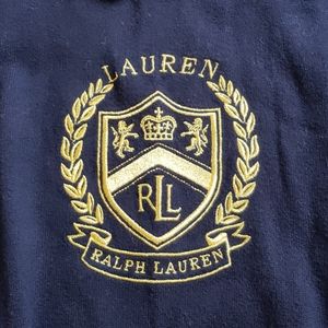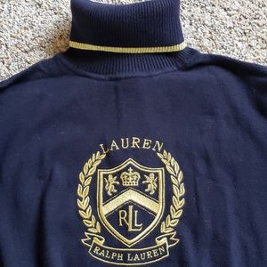This Ralph Lauren navy turtleneck sweater is embossed with the gold Lauren Crest. Excellent used condition. No pilling or signs of wear