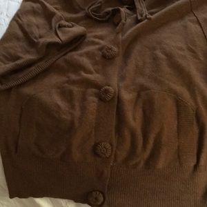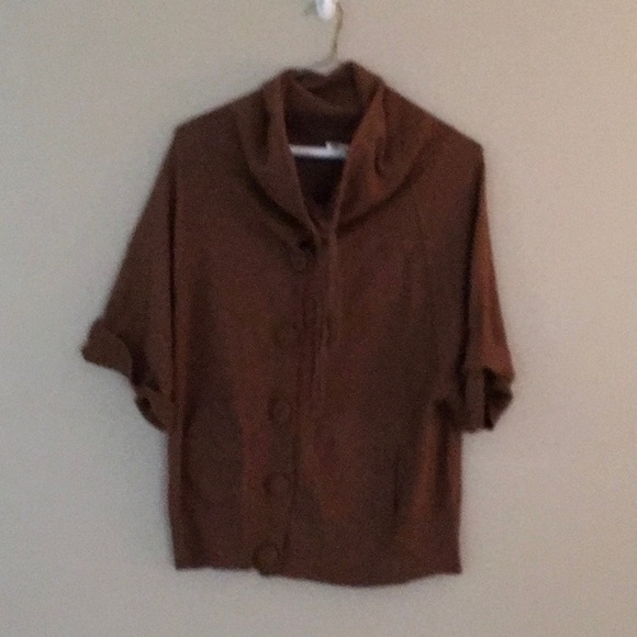 Chocolate brown short sleeve button up sweater. Can button up to scrunched neck, crocheted like matching buttons, button tab detail on sleeve, 2 front pockets,cotton,nylon and spandex