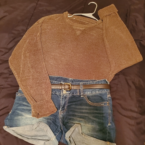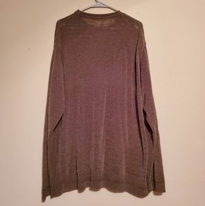 Dark Olive Green Sweater. It's personally very long on me, could be styled by tucking in pants or tied. Thin material and not too heavy of a sweater. Slightly see-through but still covered. No visible flaws.
