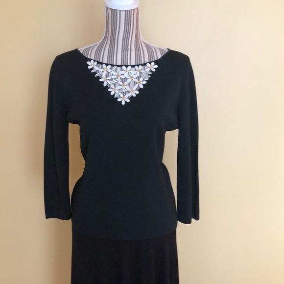 Sweater with White Leather Flower Detail is 56% Nylon, 44% Rayon